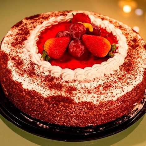Cake de vainilla con doble relleno de manjar y fresa, contiene una decoración de fresas y uvas.