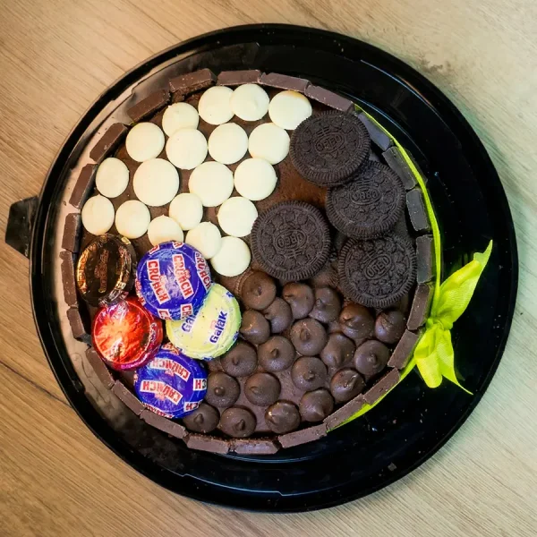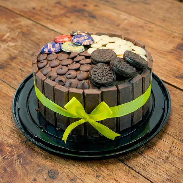 Cake de chocolate con doble relleno de manjar, con una deliciosa decoración, discos de chocolates blanco, negro y oreo, rodeada de barras de chocolate.