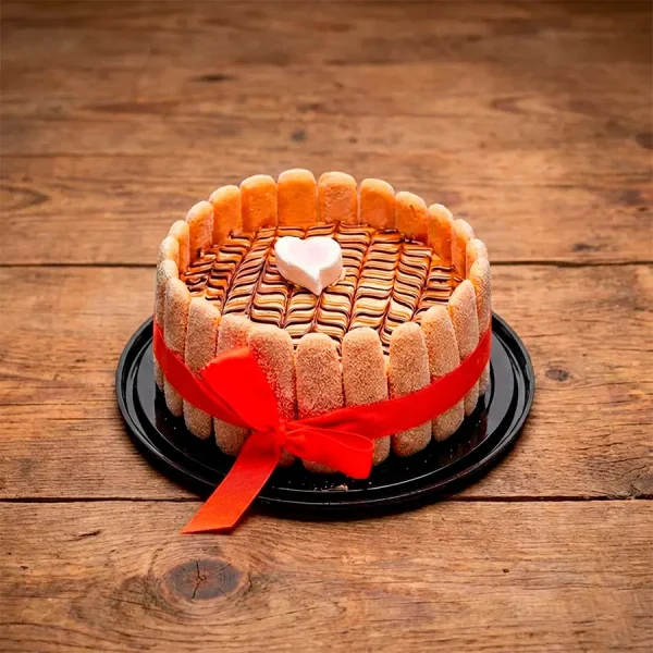 Cake de vainilla mojada con una salsa especial de café expreso, contiene doble relleno de manjar decorado con gotitas de chocolates y rodeado de bizcotelas.