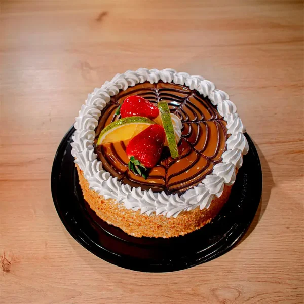 Cake de naranja con doble relleno de manjar, cubierto de manjar, contiene una decoración de fresas y rodajas de naranja.