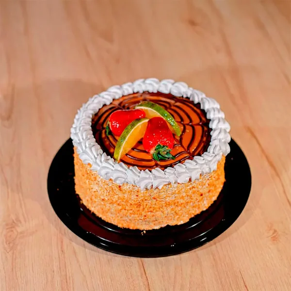 Cake de naranja con doble relleno de manjar, cubierto de manjar, contiene una decoración de fresas y rodajas de naranja.