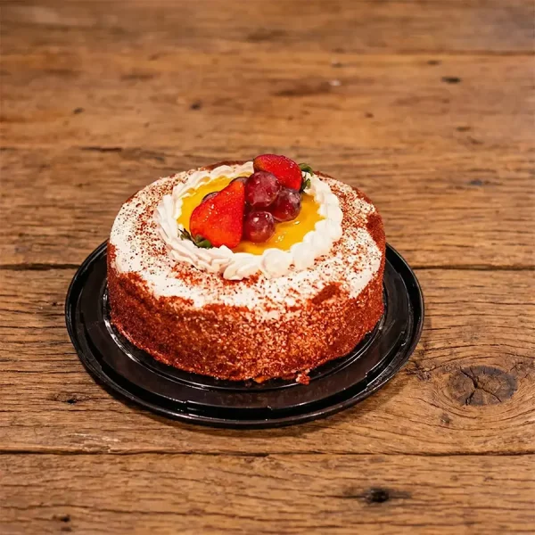 Cake de vainilla con doble relleno de manjar y piña, contiene una decoración de fresas y uvas.