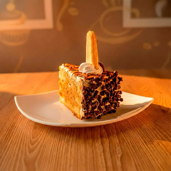 Cake de va1inilla con sirope de café, manjar y crema de mocachino. Decorado con biscotela y chispas.