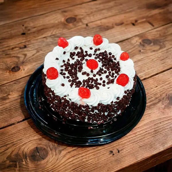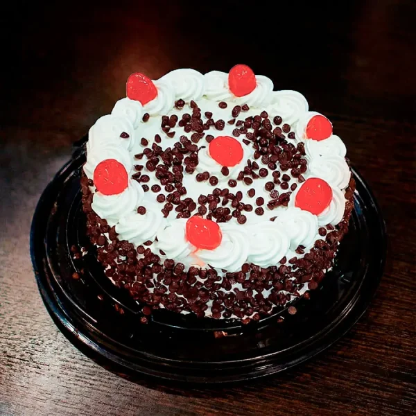 Cake de chocolate con doble relleno de manjar, trocitos de cereza roja y cubierto de chispas de chocolate.