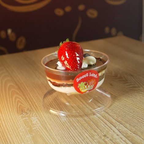 Cake de vainilla, mousse de manjar, chispas de chocolate blanco, cake de chocolate y ganache.