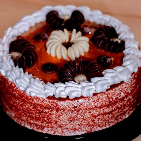 Cake de vainilla, contiene doble relleno de manjar, decorado con chispas de chocolate blanco.