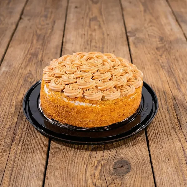 Cake de vainilla con doble relleno de manjar, con una decoración de crema especial de manjar.