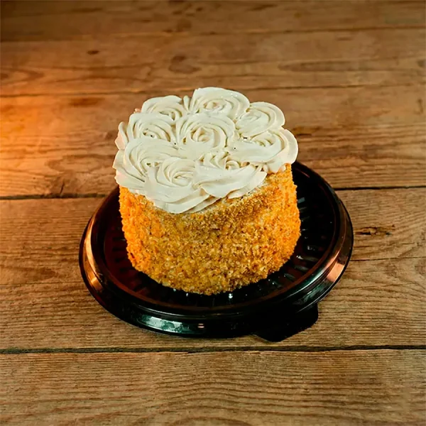 Cake de vainilla relleno de manjar, acompañado con una decoración delicada y sencilla.